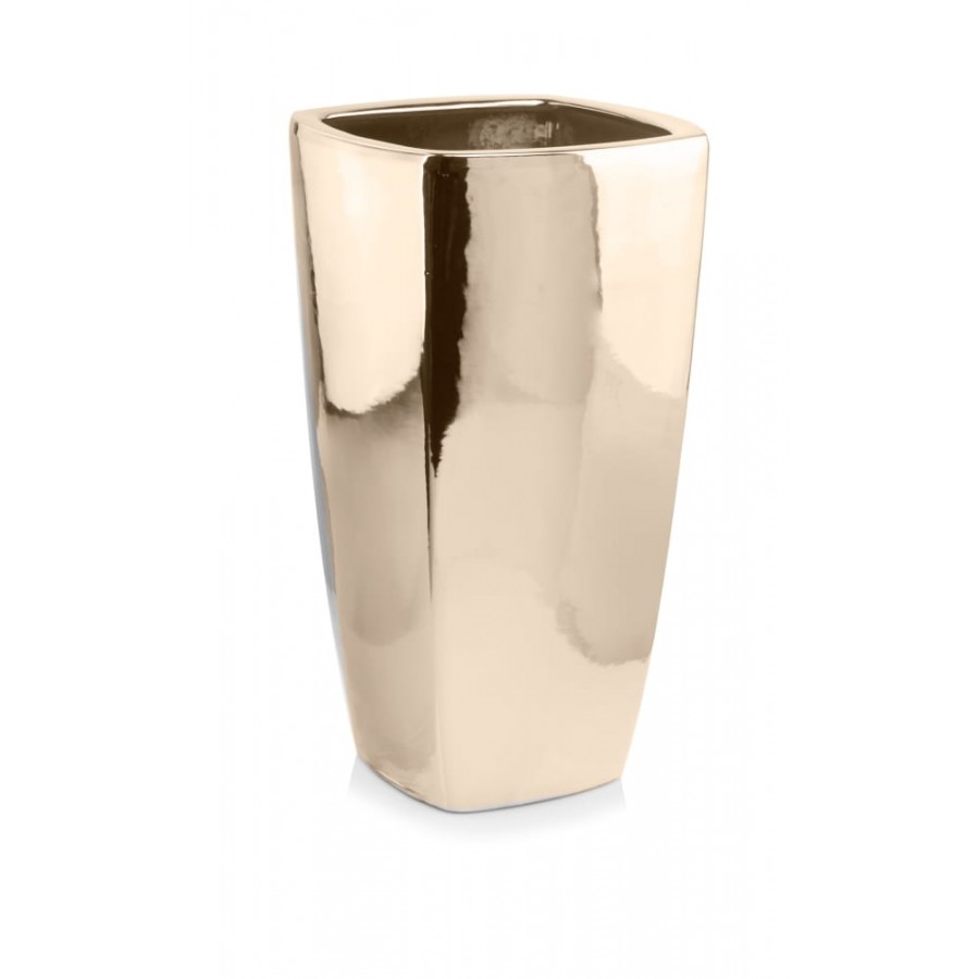 Ekskluzywna donica ceramiczna ze złotym, lustrzanym wykończeniem, w formie smukłego kwadratu z zaokrąglonymi rogami. Uniwersalna i funkcjonalna, z opcjonalnym odpływem wody.